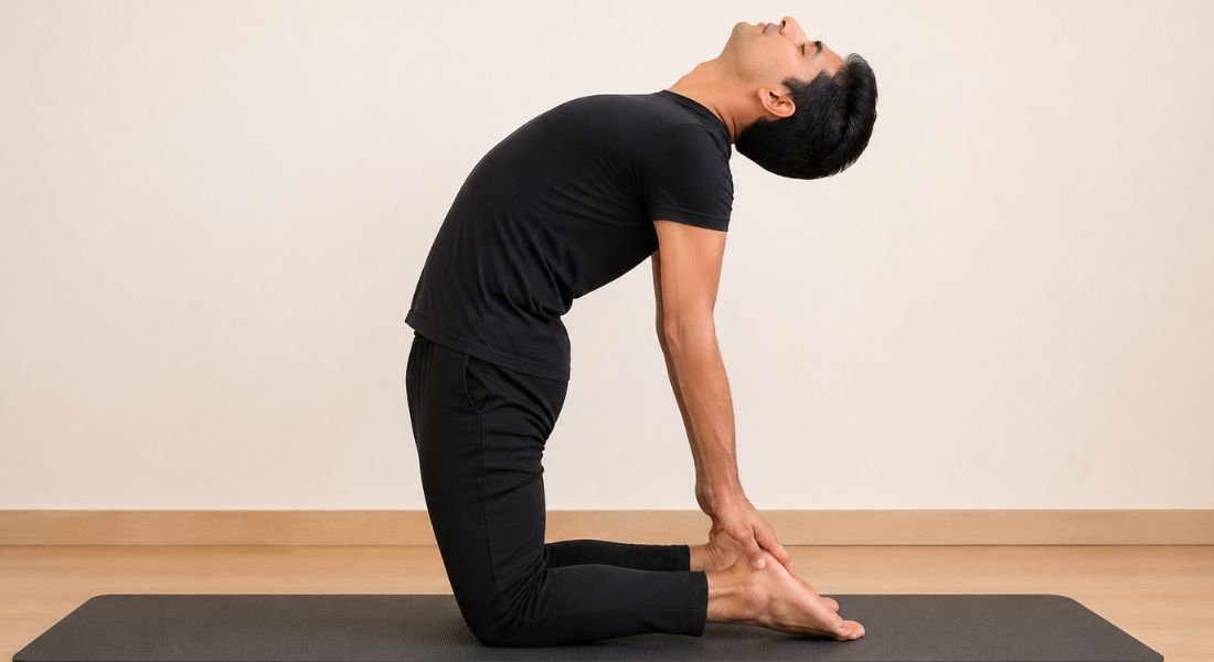 Camel pose yoga is intense because it creates a deep backbend that stretches the spine chest and front body. It also opens tight muscles that are not often used in daily movement which can feel challenging at first.